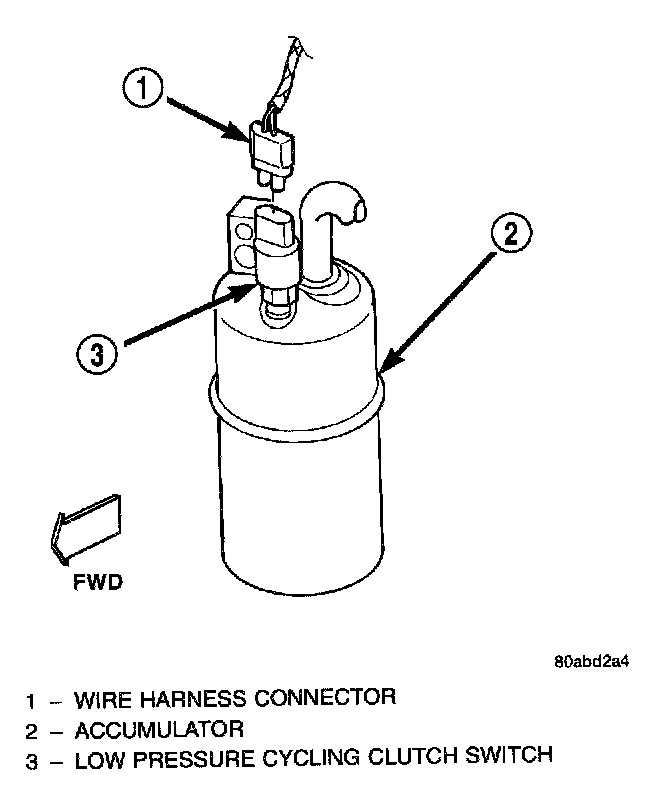 2. Unplug the wire harness connector from the low pressure cycling clutch switch on the top of the accumulator.