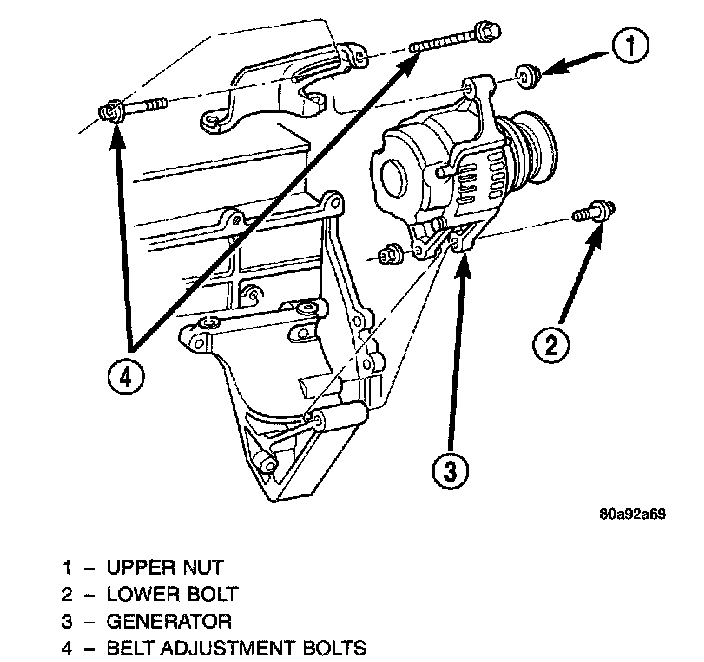 6. RHD Vehicles: Install upper nut (generator adjustment nut) and both belt adjustment bolts. Install generator lower nut/bolt.