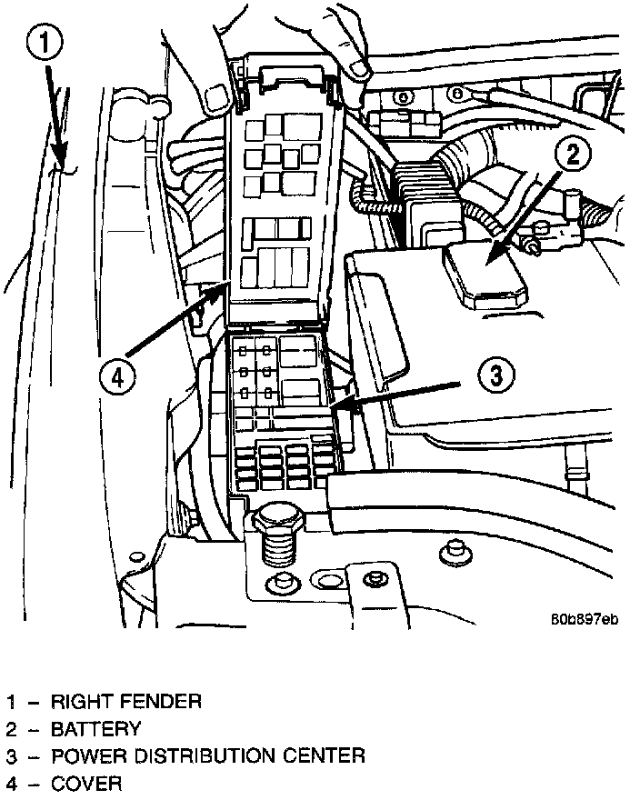 The PDC housing is secured in the engine compartment at three points. Integral mounts on both sides of the PDC housing engage and latch to stanchions that are integral to the molded plastic battery sup- port. The PDC is integral to the right headlamp and dash wire harness, which exits from the bottom of the PDC housing. The PDC housing has a molded plastic cover that includes two integral latches at the front and pivot hooks at the back that snap over a hinge pin on the rear of the PDC housing. The PDC cover is easily opened or removed for service access and has a convenient fuse and relay layout map integral to the inside surface of the cover to ensure proper component identification. A fuse puller is also stored on the inside of the PDC cover.