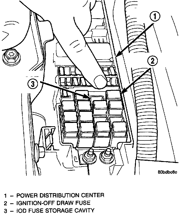 All vehicles are equipped with an Ignition-Off Draw (IOD) fuse that is removed from its cavity in the Power Distribution Center (PDC) when the vehicle is shipped from the factory. Dealer personnel are to remove the IOD fuse from the storage location and install it into PDC fuse cavity 15 as part of the preparation procedures performed just prior to new vehicle delivery.