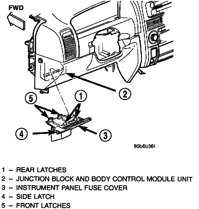 The molded plastic JB housing has integral mounts that are secured with two screws and two snap retainers to the instrument panel steering column support bracket behind the instrument panel steering column opening cover. The JB is concealed above the molded plastic instrument panel fuse cover. Integral latches molded into the fuse cover secure it the JB, the BCM and the 16-way data link connector tab of the instrument panel steering column support bracket. The fuse cover can be pulled downward to disengage the latches and provide service access to all of the fuses, relays and wire harness connectors of the JB. The fuse cover has a fuse puller and spare fuses secured to its upper surface. Refer to Instrument Panel Fuse Cover for the additional service information covering the fuse cover.