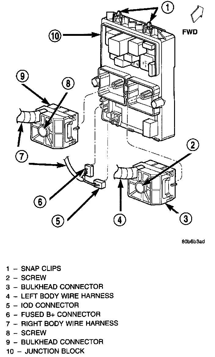 All vehicles are equipped with an Ignition-Off Draw (IOD) connector that is located in a molded connector receptacle on the lower rear surface of the Junction Block (JB) housing. The JB is concealed above the molded plastic instrument panel fuse cover. Integral latches molded into the fuse cover secure it the JB, the Body Control Module (BCM) and the 16-way data link connector tab of the instrument panel steering column support bracket. The fuse cover can be pulled downward to disengage the latches and provide service access to all of the fuses, relays and wire harness connectors of the JB. Refer to Instrument Panel Fuse Cover for the additional service information covering the fuse cover.