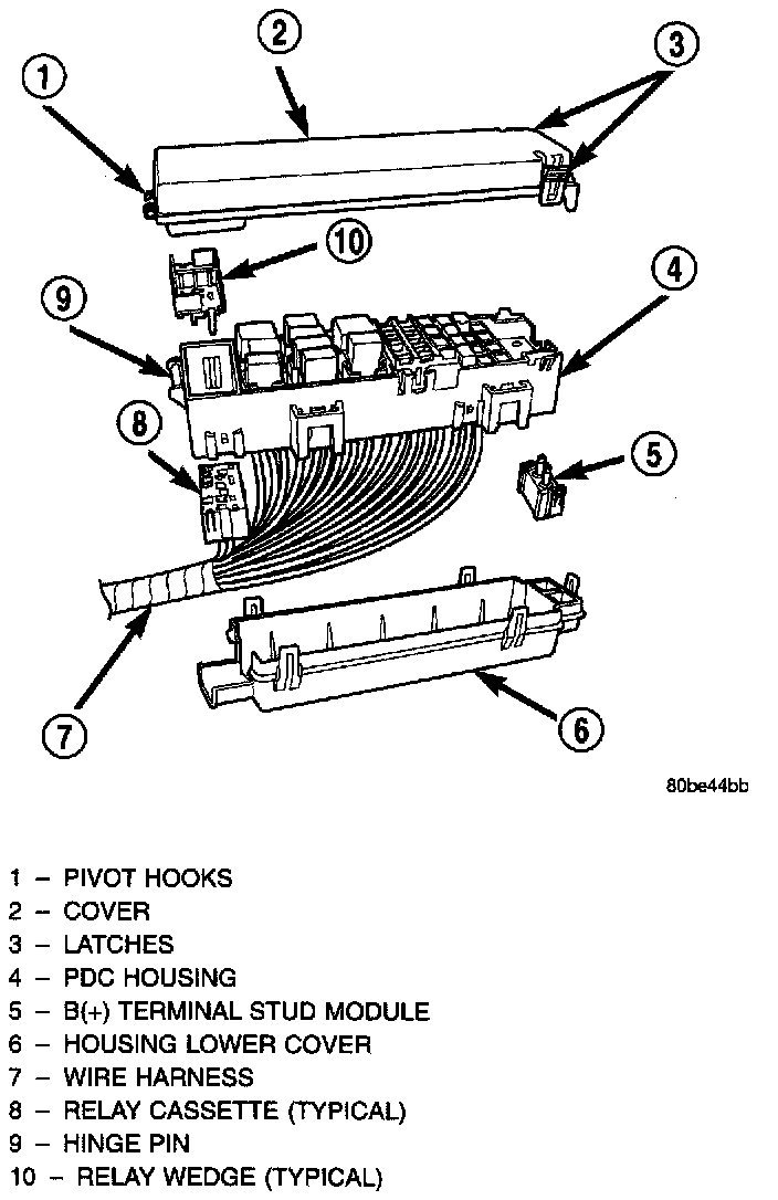The Power Distribution Center (PDC) cover, the PDC housing lower cover, the PDC relay wedges, the PDC relay cassettes and the PDC B(+) terminal stud module are available for service replacement. The PDC cover can be simply unlatched and removed from the PDC housing without the PDC being removed or disassembled. Service of the remaining PDC components requires that the PDC be removed from its mounting and disassembled.