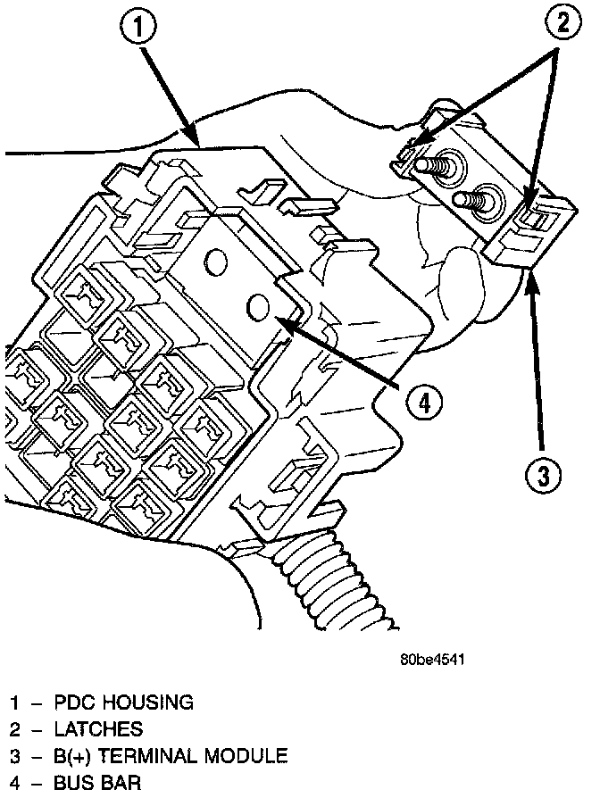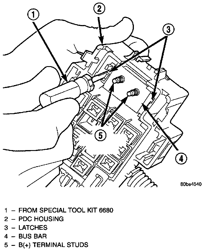 2. From the top of the PDC housing, use a small screwdriver or a terminal pick tool (Special Tool Kit 6680) to release the two latches that secure the B(+) terminal module in the PDC.