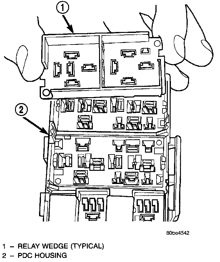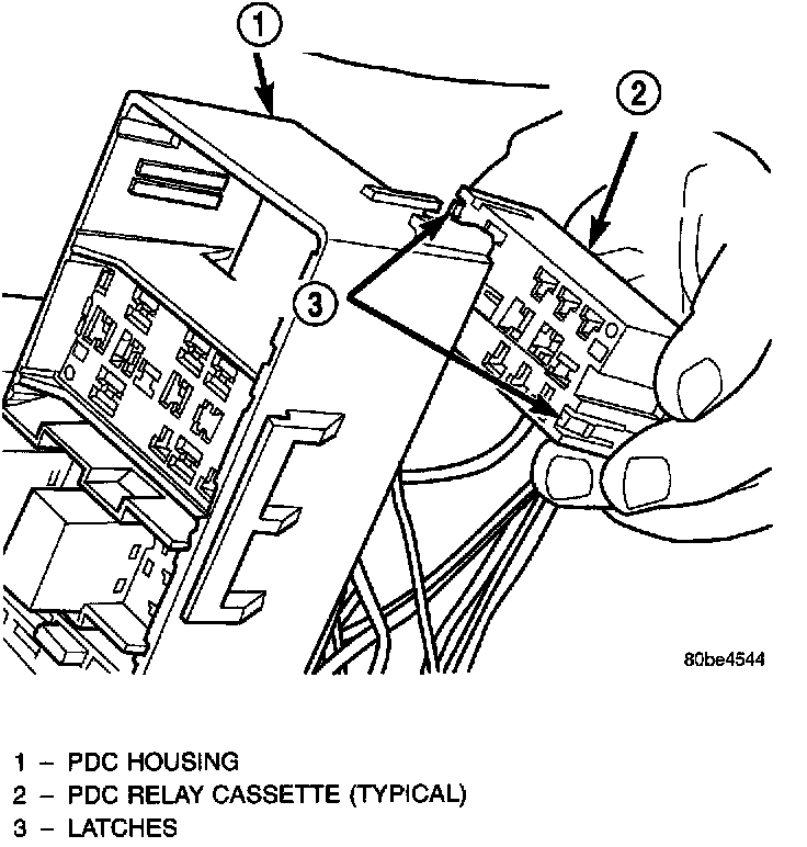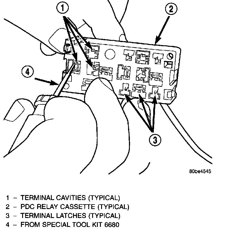 CAUTION: Proper care must be taken to be certain that the wiring and terminals from the faulty PDC relay cassette are installed in the correct terminal cavities of the replacement relay cassette. To prevent mistakes it is recommended that the wiring and terminals be removed from the faulty relay cassette one cavity at a time, repaired or spliced as necessary, then installed securely into the correct cavity of the replacement relay cassette. If you are not absolutely certain into which cavity a terminal should be installed.