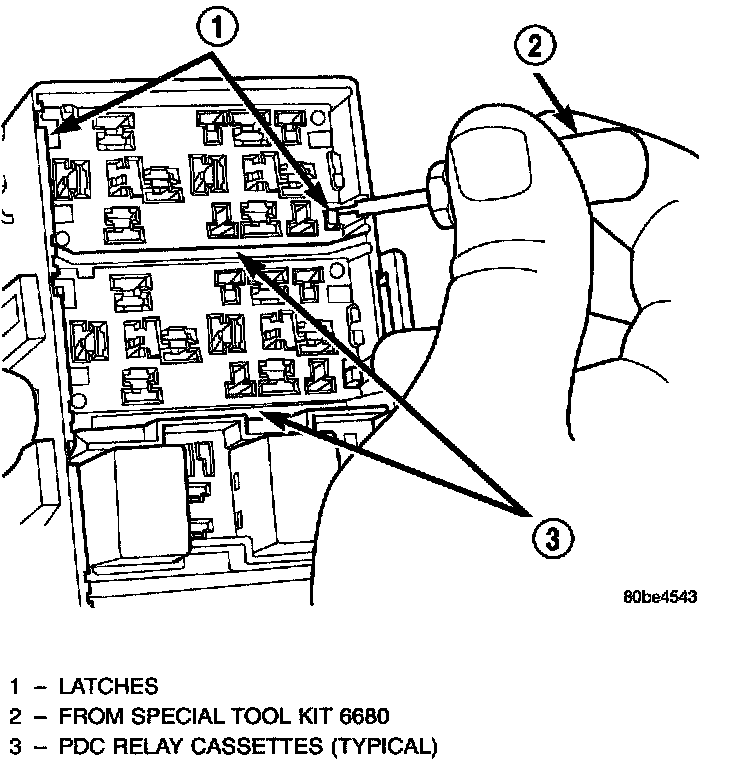 2. From the top of the PDC housing, use a small screwdriver or a terminal pick tool (Special Tool Wt 6680) to release the two latches that secure the relay cassette in the PDC.