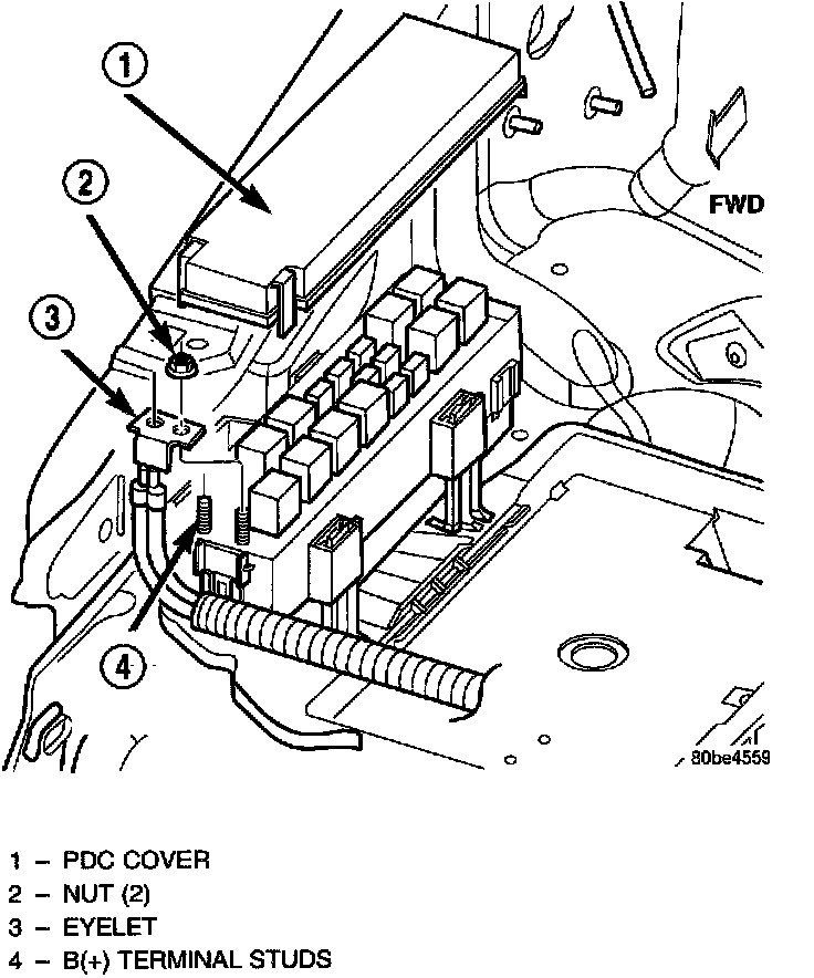 6. Remove the two nuts that secure the two-holed eyelet of the battery wire harness PDC take outs to the PDC B(+) terminal studs.