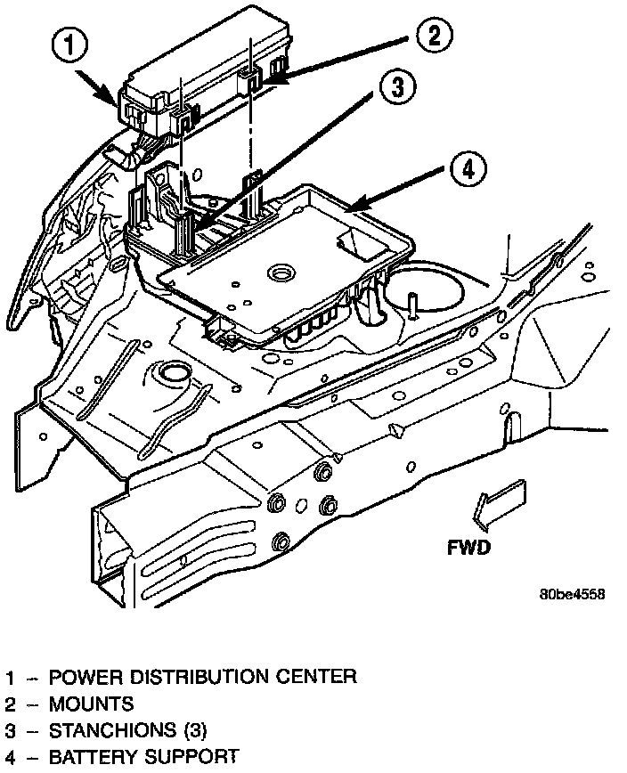 8. Disengage the latches on the PDC housing mounts from the tabs on the PDC mounting stanchions of the battery support, and pull the PDC housing upward to disengage the mounts from the stanchions.