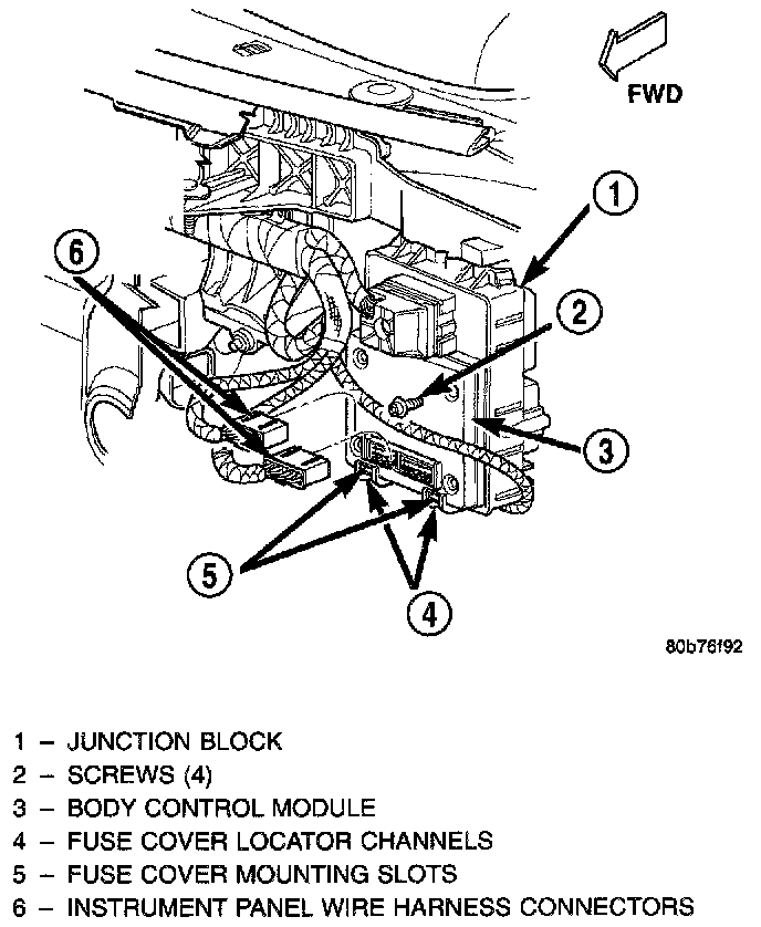 6. Install the instrument panel fuse cover to the bottom of the junction block and body control module unit.