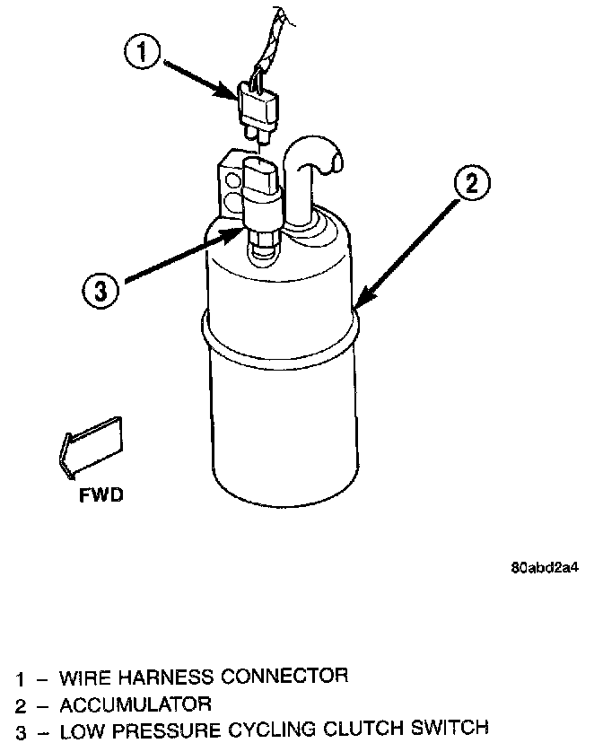 2. Unplug the wire harness connector from the low pressure cycling clutch switch on the top of the accumulator.