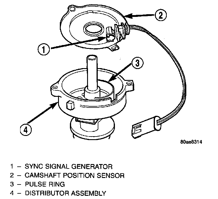 1. Install camshaft position sensor to distributor. Align sensor into notch on distributor housing.