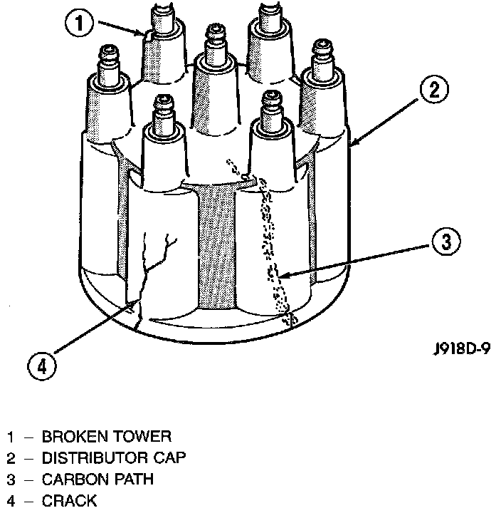 Remove the distributor cap and wipe it clean with a dry lint free cloth. Visually inspect the cap for cracks, carbon paths, broken towers or damaged rotor button. Also check for white deposits on the inside (caused by condensation entering the cap through cracks). Replace any cap that displays charred or eroded terminals. The machined surface of a terminal end (faces toward rotor) will indicate some evidence of erosion from normal operation. Examine the terminal ends for evidence of mechanical interference with the rotor tip.