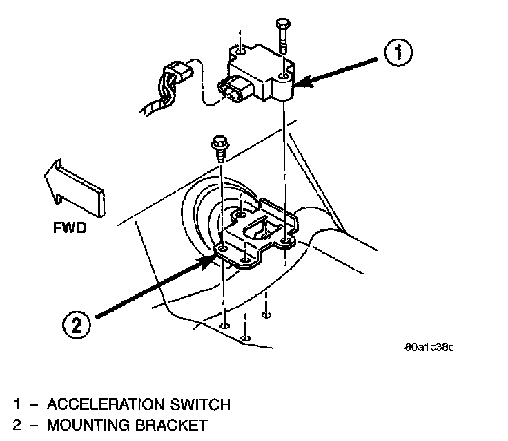 3. If the vehicle is equipped with the optional Anti-lock Brake System (ABS), remove the acceleration switch and mounting bracket from the floor panel transmission tunnel. Refer to Acceleration Switch in the Removal and Installation for the procedures.