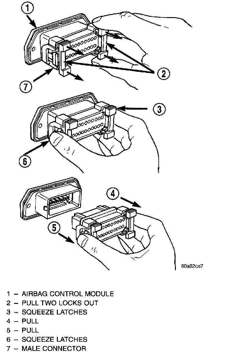 b. Squeeze the two connector latch tabs between the thumb and forefinger and pull the connector straight away from the ACM connector receptacle.