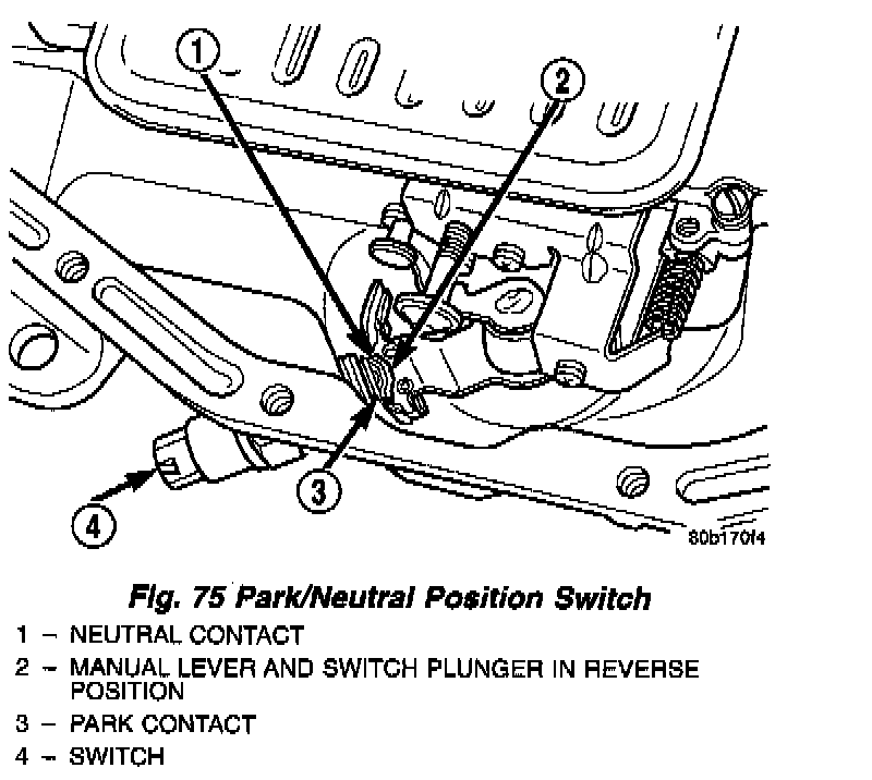 1. Move shift lever to Park and Neutral positions. Verify that switch operating lever fingers are centered in switch opening in case (Fig. 75).