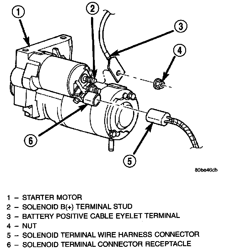 5. Remove the battery positive cable eyelet terminal from the starter solenoid B(+) terminal stud. Always support the starter motor during this process. Do not let the starter motor hang from the wire harness.