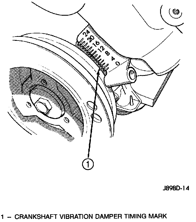 d. Slowly continue to rotate engine. Do this until timing index mark on vibration damper pulley aligns with top dead center (TDC) mark (0 degree) on timing degree scale. Always rotate engine in direction of normal rotation. Do not rotate engine backward to align timing marks.