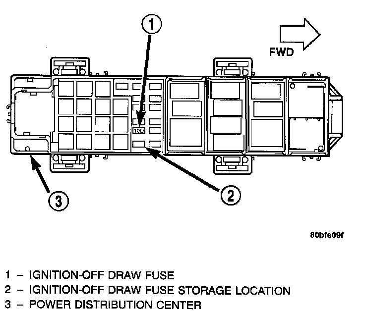 The Ignition-Off Draw (IOD) fuse is removed from Power Distribution Center (PDC) fuse cavity 25 when the vehicle is shipped from the assembly plant. Dealer personnel must install the IOD fuse when the vehicle is being prepared for delivery in order to restore full electrical system operation.
