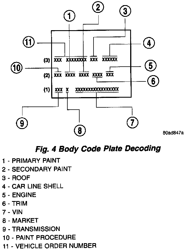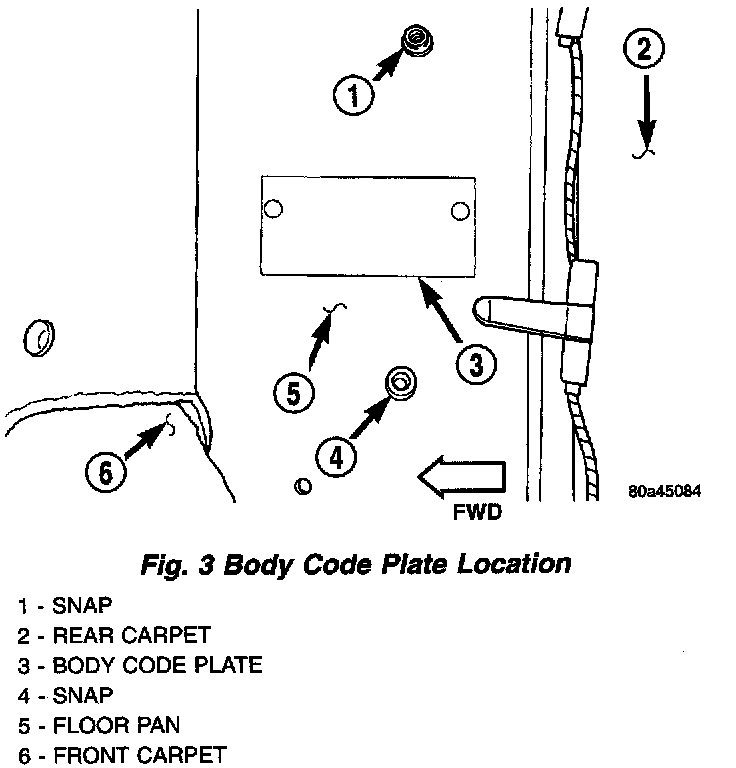 A metal body code plate is attached to the floor pan under the drivers seat (Fig. 3). Disengage the snaps attaching the carpet to the floor pan to read the information. There are seven lines of information on the body code plate. Lines 4, 5, 6, and 7 are not used to define service information. Information reads from left to right, starting with line 3 in the center of the plate to line 1 at the bottom of the plate (Fig. 4).