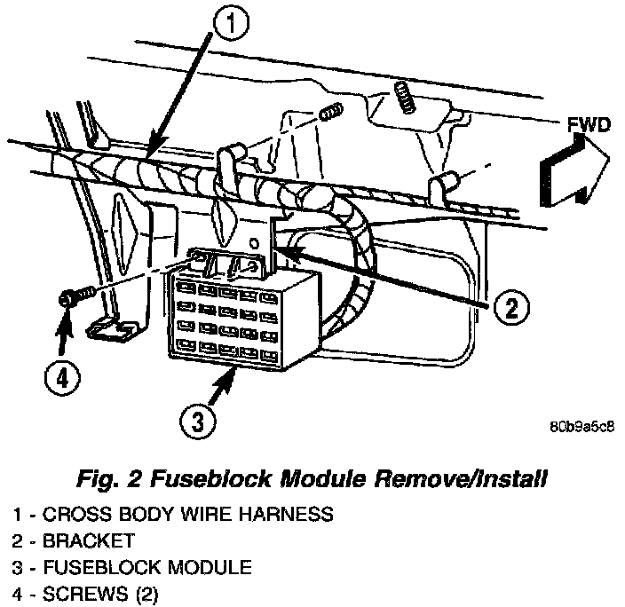 6. Remove the two screws that secure the fuse-block module to the bracket on the dash panel (Fig.2).