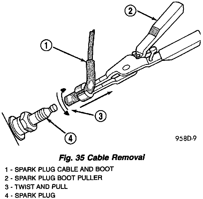 CAUTION: When disconnecting a high voltage cable from a spark plug or from the distributor cap, twist the rubber boot slightly (1/2 turn) to break it loose.
