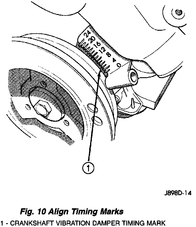 d. Slowly continue to rotate engine. Do this until timing index mark on vibration damper pulley aligns with Top Dead Center (TDC) mark (0 degree) on timing degree scale. Always rotate engine in direction of normal rotation. Do not rotate engine backward to align timing marks.