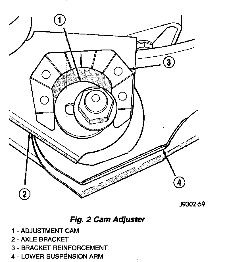 CAMBERBefore each alignment reading the vehicle should be jounced (rear first, then front). Grasp each bumper at the center and jounce the vehicle up and down three times. Always release the bumper in the down position.