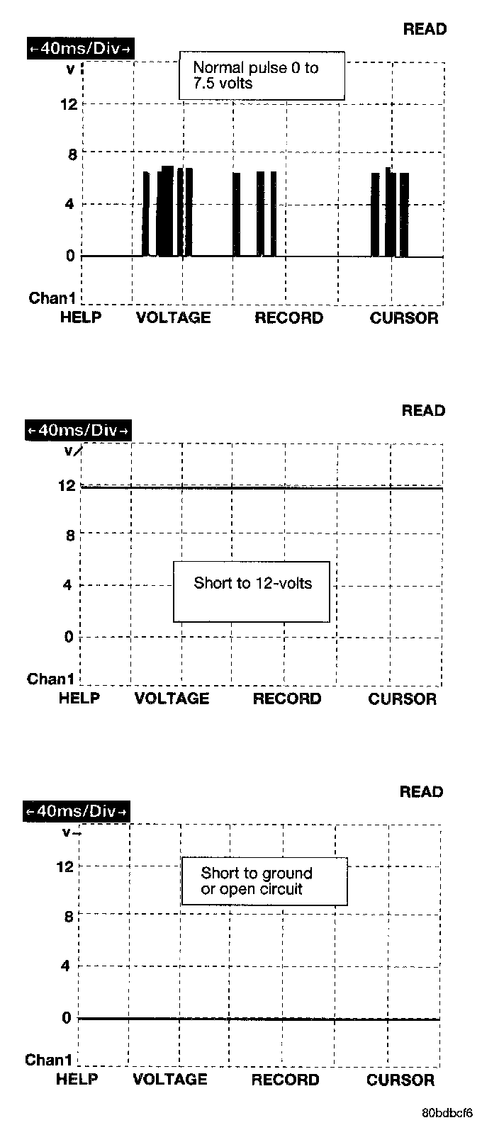 The bus messages are transmitted at a rate averaging 10800 bits per second. Since there is only voltage present when the modules transmit and the message length is only about 500 milliseconds, it is ineffective to try and measure the bus activity with a conventional voltmeter. The preferred method is to use the DRBIII lab scope. The 12v square wave selection on the 20-volt scale provides a good view of the bus activity. Voltage on the bus should pulse between zero and about seven and a half volts. Refer to the figure for some typical displays.