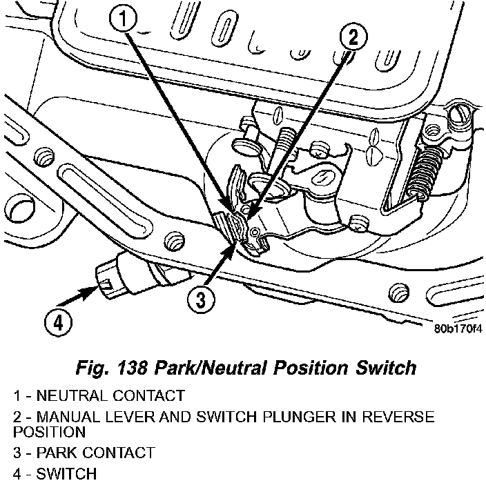 The park/neutral position switch (Fig. 138) is threaded into the side of the transmission case, just above the transmission oil pan mounting surface. The center terminal of the park/neutral position switch is the starter-circuit terminal. It provides the ground for the starter solenoid circuit through the selector lever in PARK and NEUTRAL positions only the outer terminals on the switch are for the backup lamp circuit.