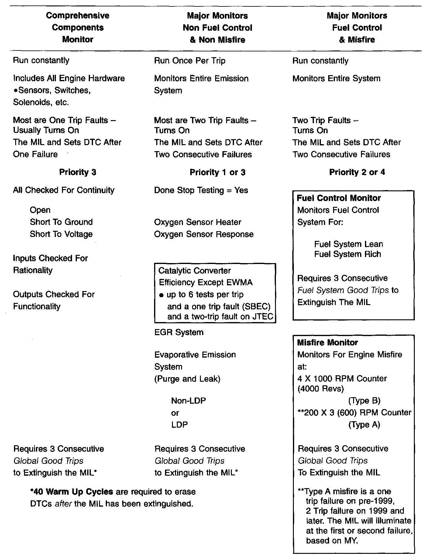 The following table summarizes the various OBDII monitors operation.