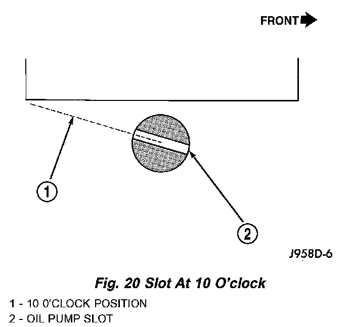14. Observe slot in oil pump gear through hole on side of engine. It should be slightly before (counterclockwise of) 10 o'clock position.