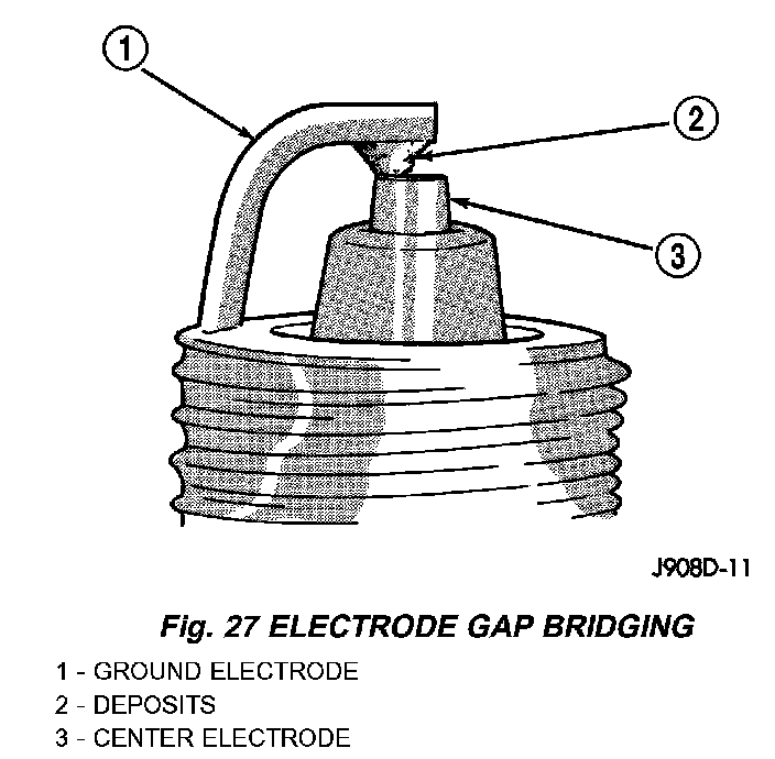 Electrode gap bridging may be traced to loose deposits in the combustion chamber. These deposits accumulate on the spark plugs during continuous stop-and-go driving. When the engine is suddenly subjected to a high torque load, deposits partially liquefy and bridge the gap between electrodes. This short circuits the electrodes. Spark plugs with electrode gap bridging can be cleaned using standard procedures.