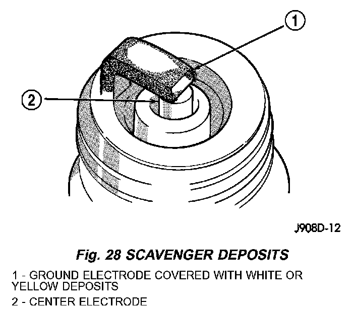 Fuel scavenger deposits may be either white or yellow. They may appear to be harmful, but this is a normal condition caused by chemical additives in certain fuels. These additives are designed to change the chemical nature of deposits and decrease spark plug misfire tendencies. Notice that accumulation on the ground electrode and shell area may be heavy but the deposits are easily removed. Spark plugs with scavenger deposits can be considered normal in condition and can be cleaned using standard procedures.