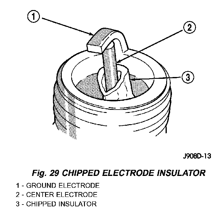 A chipped electrode insulator usually results from bending the center electrode while adjusting the spark plug electrode gap. Under certain conditions, severe detonation can also separate the insulator from the center electrode. Spark plugs with this condition must be replaced.