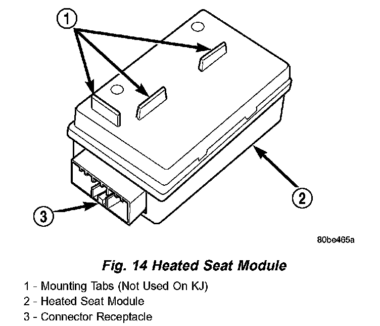 The heated seat module is also known as the Seat Heat Interface Module. The heated seat module is located under the left front seat cushion, where it is secured to a mounting bracket via two push-pin retainers. The heated seat module has a single connector receptacle that allows the module to be connected to all of the required inputs and outputs through the seat wire harness.