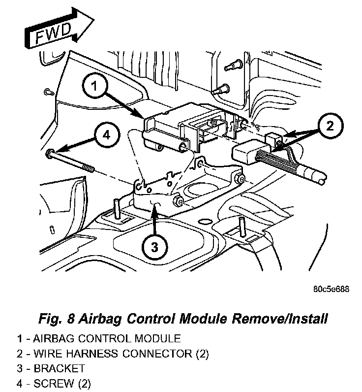 - THE AIRBAG CONTROL MODULE CONTAINS THE IMPACT SENSOR, WHICH ENABLES THE SYSTEM TO DEPLOY THE FRONT SUPPLEMENTAL RESTRAINTS. NEVER STRIKE OR DROP THE AIRBAG CONTROL MODULE, AS IT CAN DAMAGE THE IMPACT SENSOR OR AFFECT ITS CALIBRATION. IF AN AIRBAG CONTROL MODULE IS ACCIDENTALLY DROPPED DURING SERVICE, THE MODULE MUST BE SCRAPPED AND REPLACED WITH A NEW UNIT. FAILURE TO OBSERVE THIS WARNING COULD RESULT IN ACCIDENTAL, INCOMPLETE, OR IMPROPER FRONT SUPPLEMENTAL RESTRAINT DEPLOYMENT AND POSSIBLE OCCUPANT INJURIES.