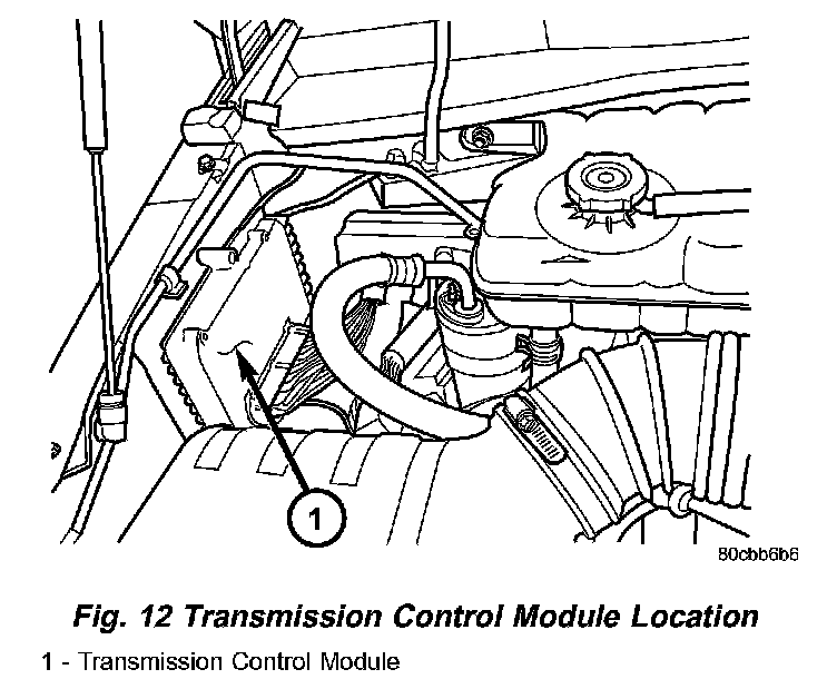 The Transmission Control Module (TCM) is located in the engine compartment on the right (passenger) side and is mounted to the inner fender (Fig. 12).