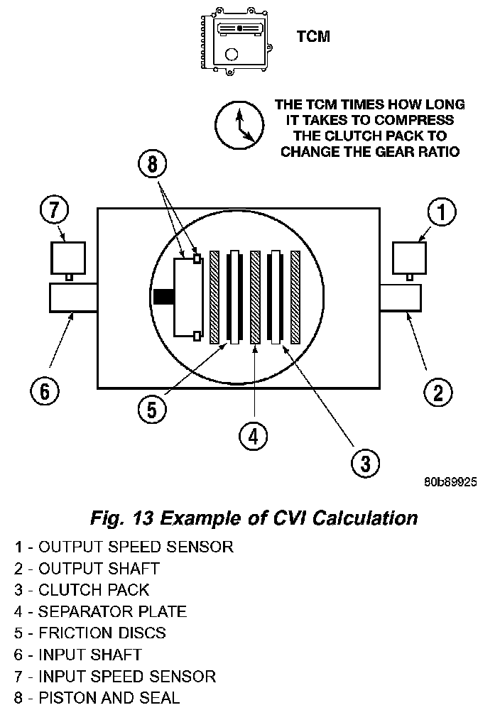 By comparing the two inputs, the TCM can determine transmission gear position. This is important to the CVI calculation because the TCM determines CVIs by monitoring how long it takes for a gear change to occur (Fig. 13).