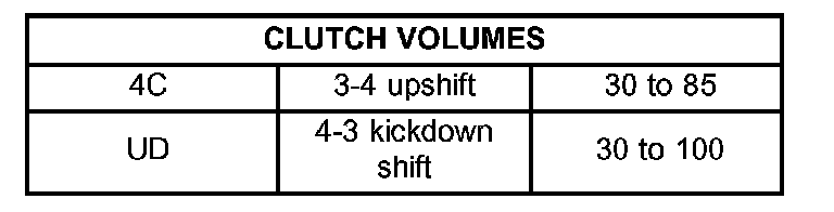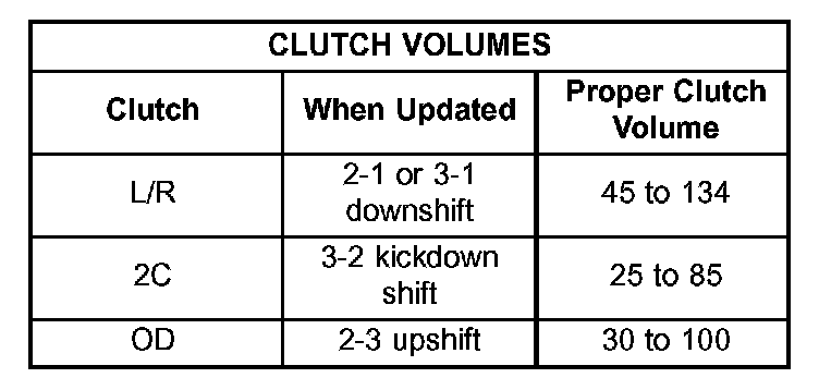 Certain mechanical problems within the input clutch assembly (broken return springs, out of position snap rings, excessive clutch pack clearance, improper assembly, etc.) can cause inadequate or out- of-range element volumes. Also, defective Input/Output Speed Sensors and wiring can cause these conditions. The following chart identifies the appropriate clutch volumes and when they are monitored/ updated: