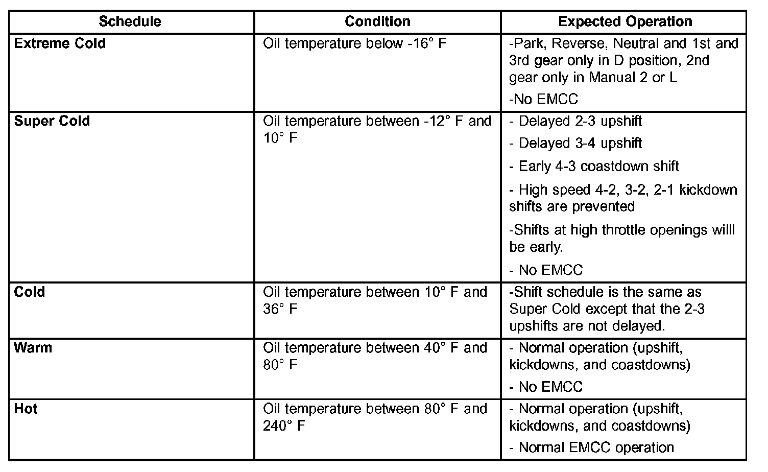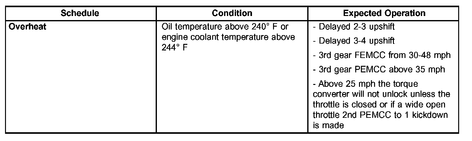 As driving conditions change, the TCM appropriately adjusts the shift schedule. Refer to the following chart to determine the appropriate operation expected, depending on driving conditions.