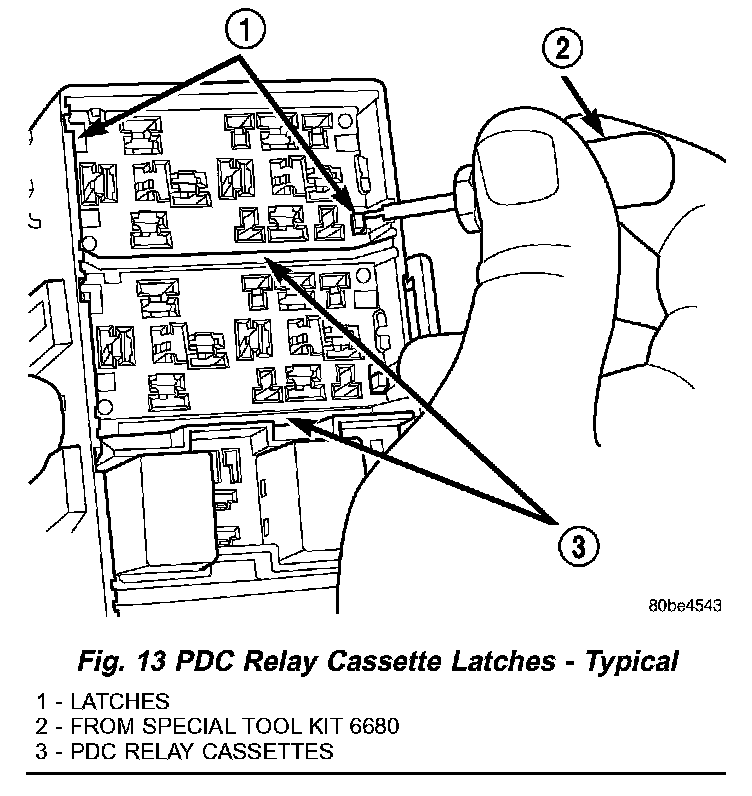 2. From the top of the PDC housing, use a small screwdriver or a terminal pick tool (Special Tool Kit 6680) to release the two latches that secure the relay cassette in the PDC (Fig. 13).
