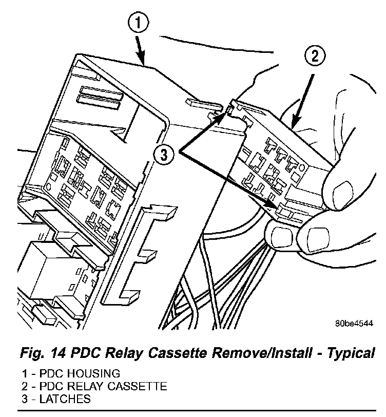 CAUTION: Proper care must be taken to be certain that the wiring and terminals from the faulty PDC relay cassette are installed in the correct terminal cavities of the replacement relay cassette. To prevent mistakes it is recommended that the wiring and terminals be removed from the faulty relay cassette one cavity at a time, repaired or spliced as necessary, then installed securely into the correct cavity of the replacement relay cassette. If you are not absolutely certain into which cavity a terminal should be installed, refer to Power Distribution in the index for the location of complete PDC wiring diagrams.