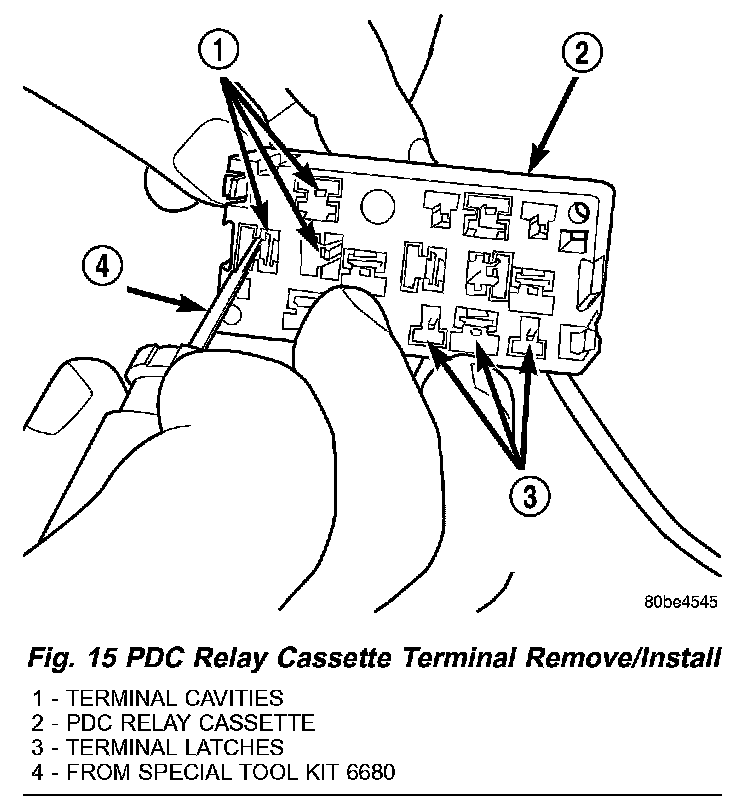 4. While pulling gently on the wire from the bottom of the faulty PDC relay cassette, use a terminal pick tool (Special Tool Kit 6680) from the top of the relay cassette to release the latch that secures the terminal in the relay cassette terminal cavity (Fig.15).