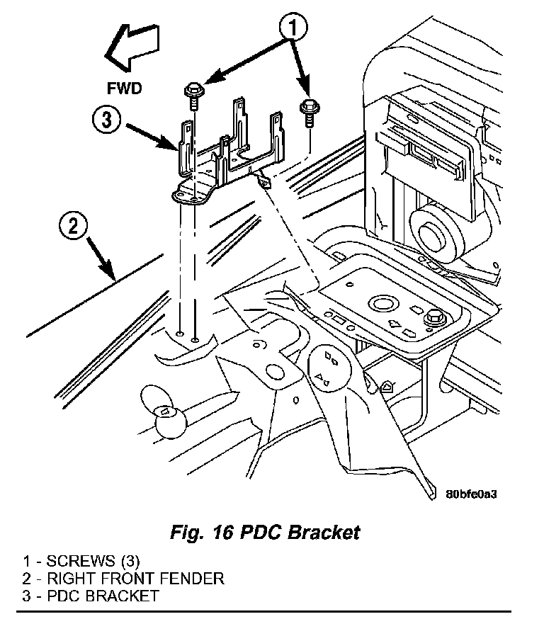 3. Remove the three screws that secure the PDC bracket to the right front inner fender (Fig. 16).