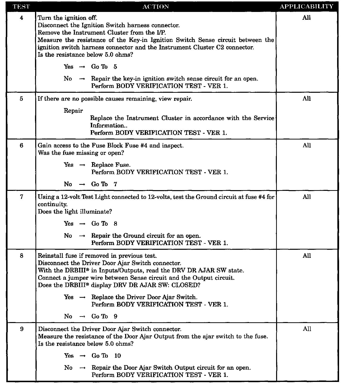 CHIME INOPERATIVE WITH KEY IN IGNITION, DRIVER'S DOOR OPEN