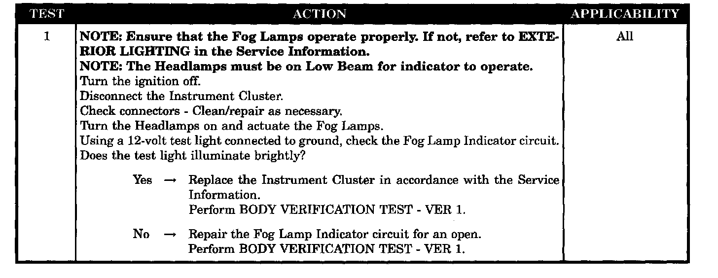 FOG LAMP INDICATOR INOPERATIVE - DOMESTIC
