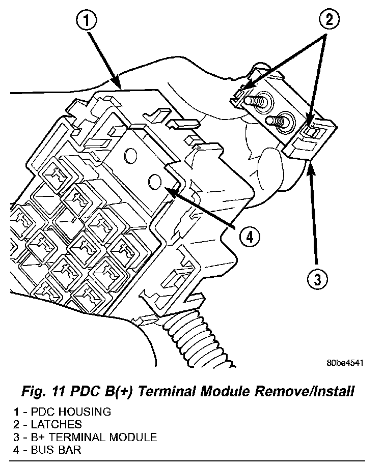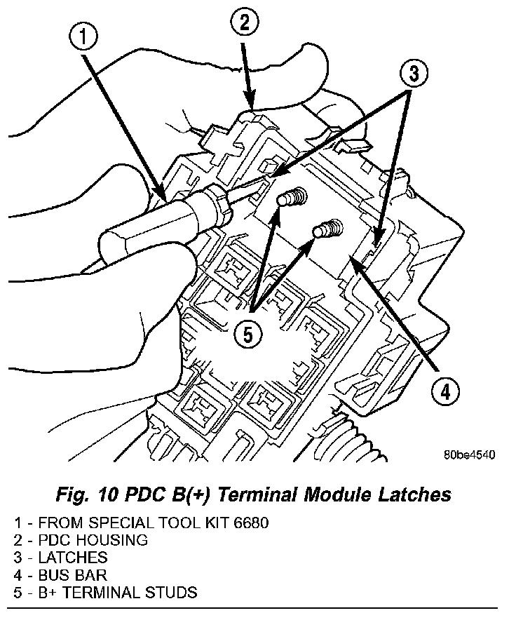 2. From the top of the PDC housing, use a small screwdriver or a terminal pick tool (Special Tool Kit 6680) to release the two latches that secure the B(+) terminal module in the PDC (Fig. 10).
