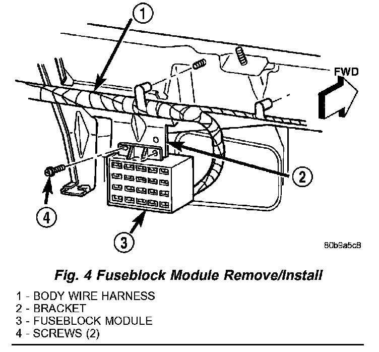 6. Remove the two screws that secure the fuse- block module to the bracket on the dash panel (Fig.4).
