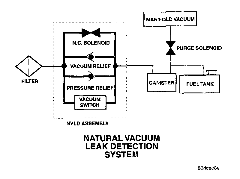 The basic leak detection theory employed with NVLD is the "Gas Law". This is to say that the pressure in a sealed vessel will change if the temperature of the gas in the vessel changes. The vessel will only see this effect if it is indeed sealed. Even small leaks will allow the pressure in the vessel to come to equilibrium with the ambient pressure. In addition to the detection of very small leaks, this system has the capability of detecting medium as well as large evaporative system leaks.