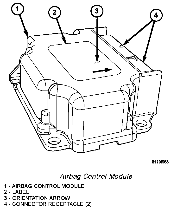 An arrow printed on the label on the top of the ACM housing provides a visual verification of the proper orientation of the unit, and should always be pointed toward the front of the vehicle. The ACM housing has integral mounting flanges on three corners. The mounting flange to the right of the connector receptacle has an integral locating pin on its lower surface. Both right side flanges have round mounting holes, while the flange on the left side has a slotted mounting hole. A molded plastic electrical connector with two receptacles, one containing twenty-four terminal pins and the other containing thirty-two terminal pins, exits the forward facing side of the ACM housing. These terminal pins connect the ACM to the vehicle electrical system through two dedicated take outs and connectors, one from the instrument panel wire harness and the other from the body wire harness.